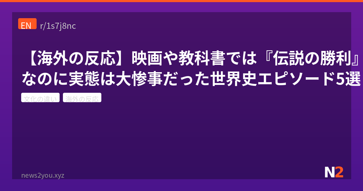 Redditの歴史好きたちに「英雄的勝利として教えられてるけど、実はPRで隠蔽された大失敗だった出来事って何?」と聞いたら、教科書をひっくり返すような回答が続々と集まった。コメント数800超え、スコア1500超えの大盛り上がりスレから厳選してお届けします。あなたが知ってる「あの名場面」、実は黒歴史かもしれませんよ。