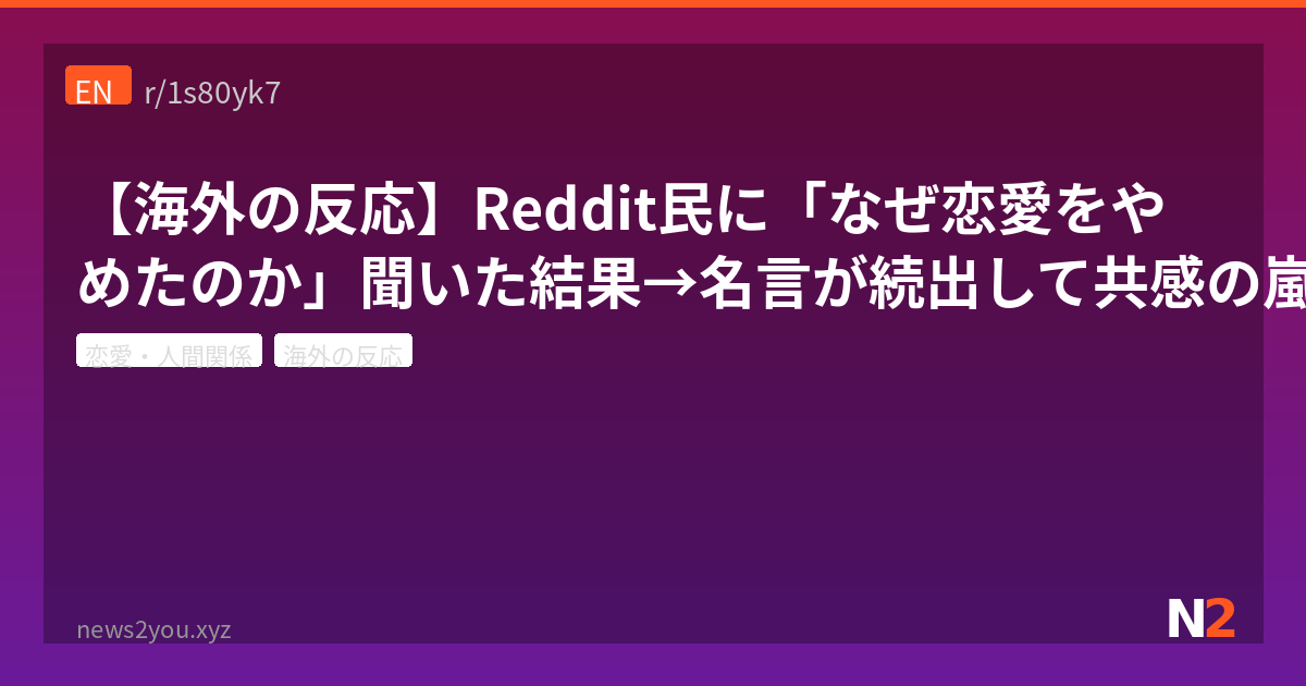 海外掲示板Redditで「もう恋愛しなくなった理由って何?」というスレが立ち、2400件以上のコメントが殺到。読んでみたら、笑えるのに刺さる名言のオンパレードだった。世界中の恋愛疲れ民たちのリアルな声をお届けします。