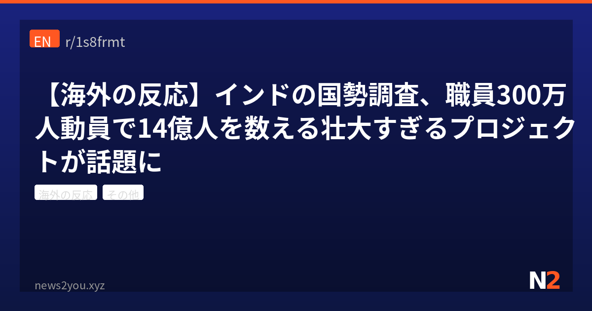 インドが世界最大の国勢調査をスタートさせるというニュースが海外掲示板で話題になっていました。なんと動員される職員の数は300万人以上、数える対象は14億人。もはやスケールが違いすぎて笑うしかないレベルです。海外ユーザーたちの反応をまとめました。