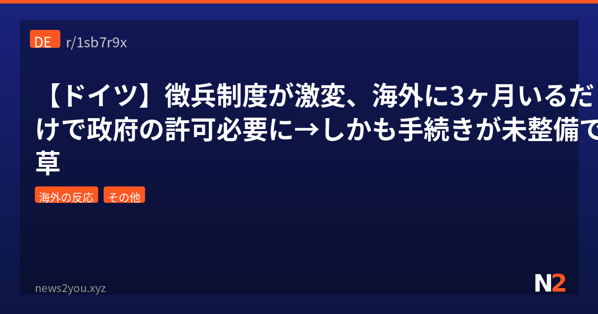 ドイツで今年からとんでもない法改正が静かに施行されてたのが発覚して大騒ぎになってるんよ。18歳から45歳未満の男性が3ヶ月以上海外に滞在する場合、なんと連邦軍(Bundeswehr)の許可が必要になったんだと。しかも一番ヤバいのが、その許可を出す手続き自体がまだ整備されてないっていうね。r/de(ドイツ語圏の大手サブレ)のコメント欄が皮肉と怒りで大炎上してたからまとめたわ。