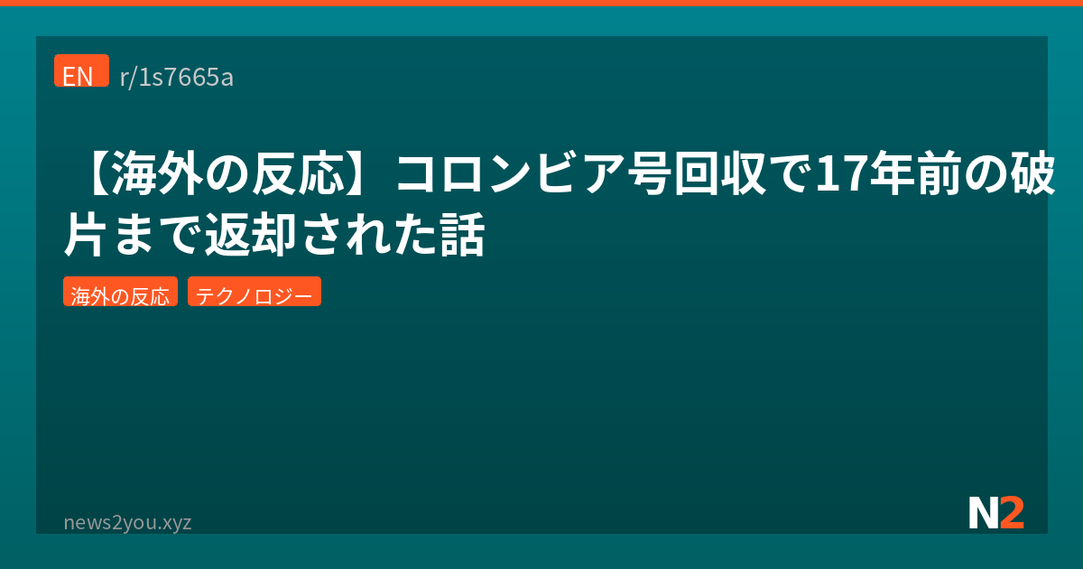 ✍️ 管理人: 『略奪』の一語で空気が全部変わるのほんまワロタ。日本だと事故の遺留品持ち去りはかなり強い道徳違反として語られやすいけど、アメリカみたいに土地が広くて破片が散ると管理の目が届きにくいぶん、問題が別の形で出るんだな。ちなみにRedditはこういう一単語ツッコミをオチに置くのがめちゃ強くて、短いほど刺さる文化がある。ワイも結局、宇宙技術の話が最後は人間の欲と民度の話に着地するの、いかにもネットっぽくて好きだわ。