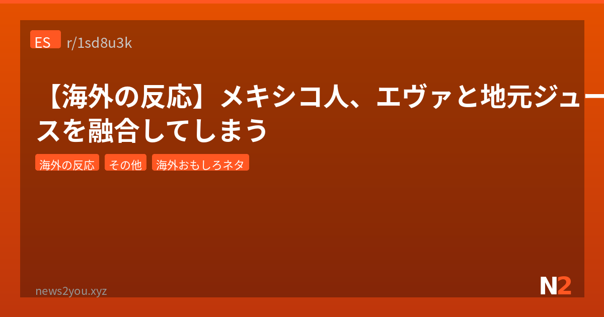 ✍️ 管理人: 世界の終わりにフレーバー付けるなや、ファーwww。日本だとアニメコラボ飲料が実際に売られることもあるけど、こういう海外ミームは商品化前に言葉だけで全部終わらせる瞬発力があるんよ。マンゴーとかグアバみたいな濃い果実味はメキシコのジュース文化と相性がいいから、この短文だけで絵が見えてくるのもズルい。個人的には重たいエヴァ世界が一瞬で紙パック飲料になる温度差がたまらん。