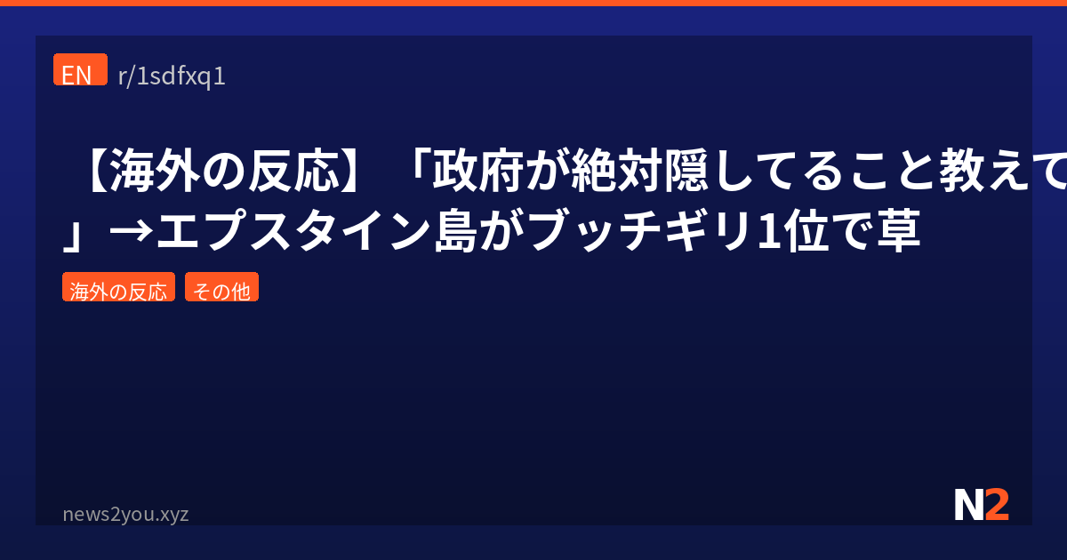 ✍️ 管理人: 「Epstein didn't kill himself(エプスタインは自殺じゃない)」っていうのはアメリカのネットミームとしてもう完全に定着してるんよ。2019年にNY連邦拘置所で首を吊って死亡したとされてるけど、監視カメラが「故障」、看守が「居眠り」、同房者が「移動済み」と、不審な点が多すぎて陰謀論が止まらない。日本で言うと赤木ファイル問題みたいに「公式発表を信じてない国民が大多数」っていう状態がずっと続いてるわけ。Redditでは全く関係ないスレでも突然「Epstein didn't kill himself」って書き込まれるのが定番ネタになってて草。