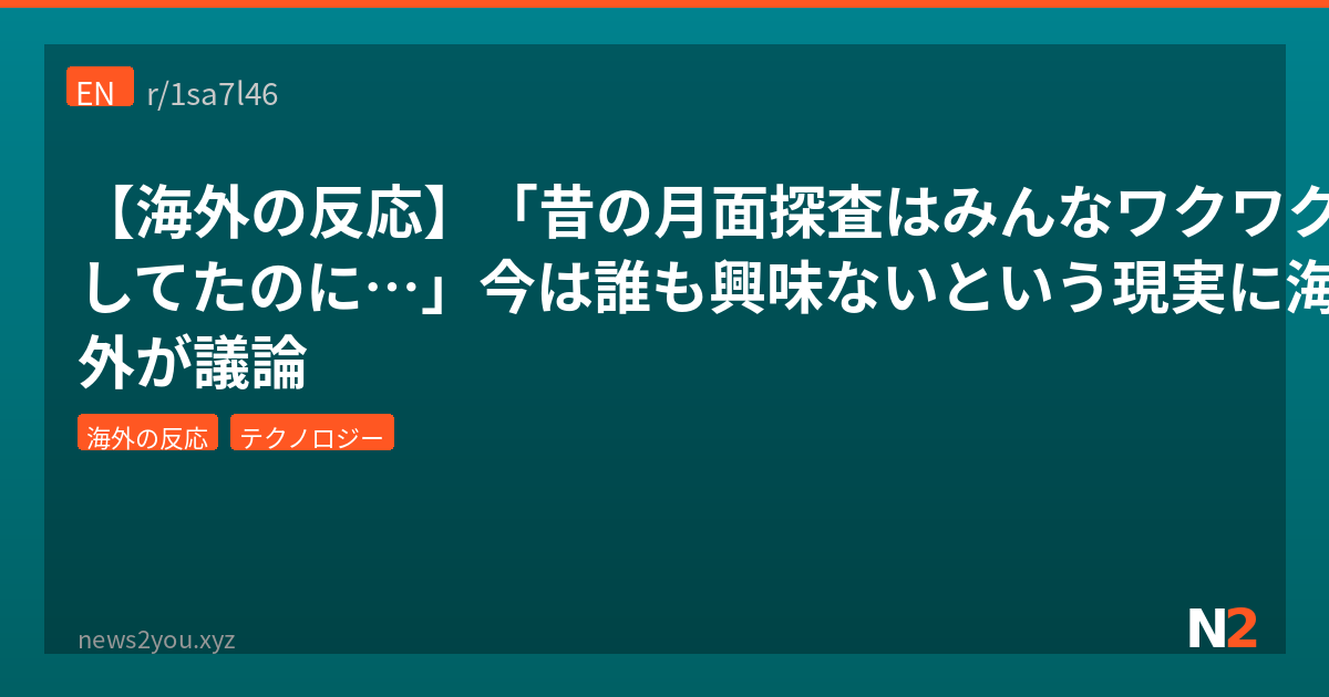 「月に興味なくなった」じゃなくて、おまえら生活に殴られすぎて空見上げる余裕すら消えただけだろwww しかもアポロの頃は国家の威信、今は金持ちの事業って見えた瞬間に冷めるの、わりと正直で草。夢を語るには現実が重すぎんだよな。