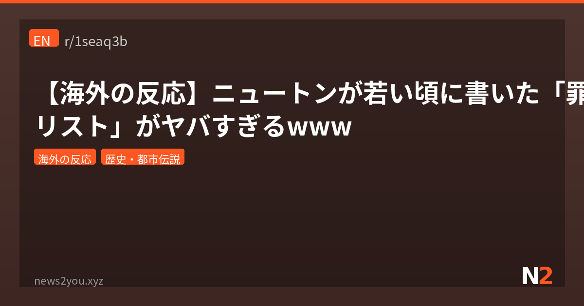 ニュートンの罪リスト、天才の人間臭さが全開で最高だったわ。万有引力を発見した男が「妹殴った」「家燃やすぞ」とか書いてるの、ギャップがエグすぎる。日本だと偉人伝って美談ばっかりになりがちだけど、海外だと「偉大な人物ほど人間的な欠点がある」って普通に語られるんよな。実際、日本の教科書でもニュートンは「リンゴが落ちるのを見た人」くらいの扱いだけど、錬金術にハマってたとか、ライバルのフックやライプニッツとドロドロの争いしてたとか、そういう話はほぼ出てこない。コメント欄の重力ジョークも含めて、Redditらしい知的で笑えるスレだったわ。ちなみにニュートンのこの罪リストは1662年頃、19歳の時に書かれたもので、ケンブリッジ大学入学直後のノートに残ってたらしい。天才も思春期は荒れるんだなって、なんかちょっと安心するよな。みんなも若い頃のやらかしリスト作ったら何個くらい出てくる?