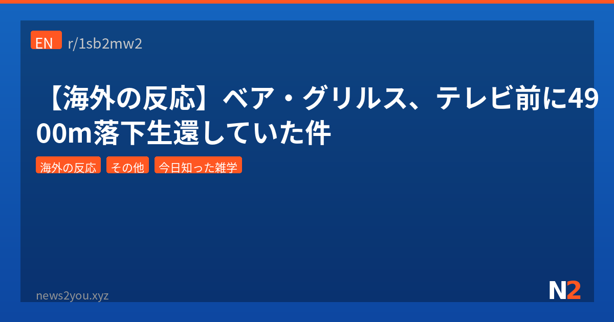 今回の話、単なる「ベアすげえ」で終わらんのが面白いんよ。テレビで虫食ったり尿飲んだりしてるからネタキャラっぽく見えるけど、その前に本物の事故を生き延びてるから説得力がバグってる。日本でも体張る番組は多いけど、富士山より高い約4870メートルから落下して復帰、その後に世界的サバイバル番組の顔になる流れはさすがにレアすぎる。しかもRedditでは「ヤラセ疑惑はあっても、本人がガチなのは否定できない」って評価に落ち着いてるのが興味深いわ。海外だとリアリティ番組は演出込みで楽しむ文化が強くて、出演者の実体験や軍歴がブランド価値になるんだなと考えさせられる。これ、前に話題になってた“元軍人や冒険家がテレビで無双する系”のスレとも通じる話で、視聴者は結局「本物感」に弱いんよな。ワイ個人的には、ベアのすごさってサバイバル技術そのものより、死にかけた後もその世界に戻るメンタルの方だと思う。みんなはこういう「演出ありでも本人スペックが本物ならアリ」ってタイプ、どこまで許せる?