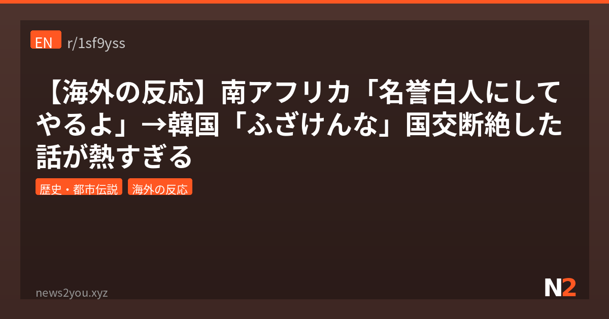 アパルトヘイト時代の南アフリカが東アジア諸国に「名誉白人」のステータスをばらまいてたって知ってた?要するに「お前らは白人扱いしてやるから貿易しようぜ」っていう、今考えるとドン引きレベルの提案なんだけど、これを韓国に持ちかけたら「は?ふざけんな」って国交断絶されたっていう話がRedditで盛り上がってたんよ。そもそも人種差別を国の制度として運用してた国が「お前のランク上げてやるよ」って言ってくること自体がヤバいんだけど、それを真正面から突っぱねた韓国の対応に海外ニキたちも熱くなってたわ。