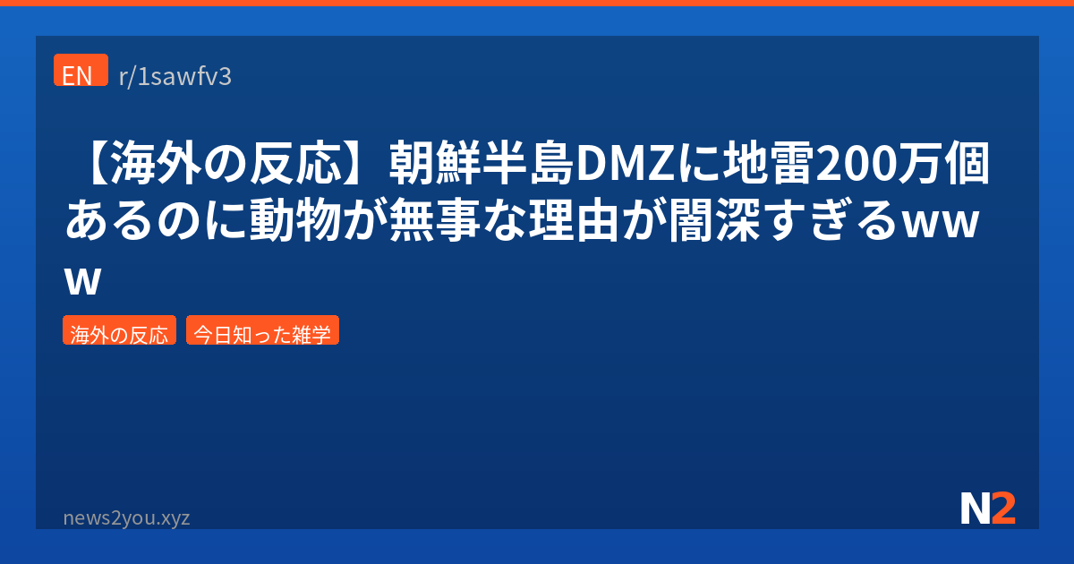 ✍️ 管理人: オチが完璧すぎて草。「クレーム入れられるほど長生きしない」ってブラックジョーク、Redditらしさ全開だわ。でもこれ笑い事じゃなくて、実際にDMZ周辺では韓国軍の兵士が地雷で負傷する事故が2015年にあって、南北間の緊張が一気に高まったことがあるんよな。動物は「クレーム入れられない」けど、人間が踏んだら国際問題になるレベル。日本も対人地雷禁止条約(オタワ条約)に加盟してるけど、北朝鮮も韓国も未加盟なのが闇深い。ちなみに韓国は2023年にようやく対人地雷の使用停止を宣言したけど、DMZの既存の地雷はそのままっていう。