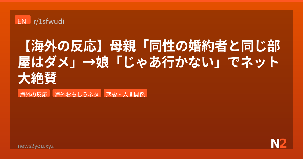 家族旅行で母親に「婚約者と同じ部屋で寝るな」って言われたらどうする?しかもその理由が同性カップルだからって…。今回はRedditのr/AmItheAsshole(自分が悪いか判定してもらう掲示板)に投稿された、同性婚約者との家族旅行トラブルが大炎上した話を紹介するで。投稿者は28歳女性で、27歳の女性と婚約中。2年以上同棲して家も買って、半年後には結婚式なのに、ママンが「同じ部屋はちょっと…」とか言い出したんよ。しかも宿泊費は自分で払うのに。さあ、海外ニキたちの反応を見ていこう。
