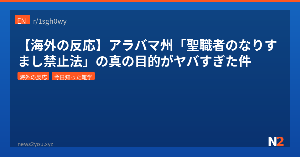 今回の話題、要するに「公民権運動を弾圧するために聖職者のなりすまし禁止法を作った」っていうアラバマ州の黒歴史なわけだが、これがまだ廃止されてないってのがヤバすぎる。日本でも「破壊活動防止法」みたいに制定当時の政治的意図が強い法律はあるけど、ここまで露骨に差別目的で作られた法律が残ってるのはアメリカならではだと思う。コメント欄でも指摘されてたけど、そもそも「誰が本物の聖職者か」を政府が判断すること自体が政教分離に反してるわけで、最初から憲法違反の可能性が高い法律だったんよな。1965年のセルマの行進では、全米から聖職者が駆けつけて人種差別に立ち向かったわけだが、その勇気ある行動を潰すために法律を作るっていう発想がもう終わってる。ちなみにアメリカにはこういう「ゾンビ法」が各州にゴロゴロ残ってて、Reddit民が発掘するのが一種の娯楽になってるのも面白い。法律って一度作ると廃止するのにもエネルギーがいるから、誰も手をつけないまま放置されるんだろうな。みんなは自分の住んでる地域に「なんでこんな法律あるの?」ってやつ、知ってたりする?調べてみると意外な歴史が出てくるかもしれんぞ。