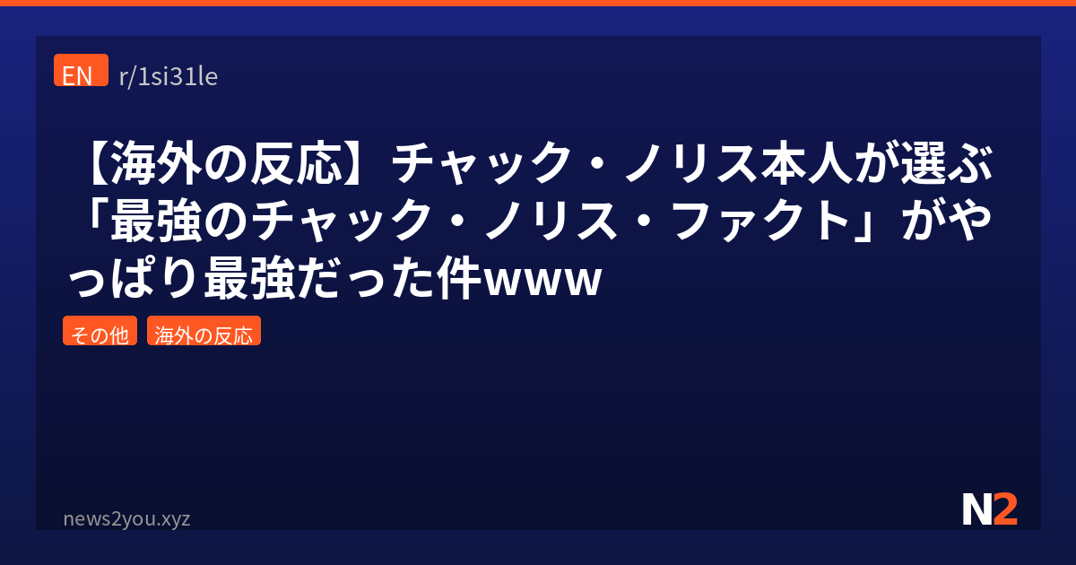 チャック・ノリス・ファクトって、ネットミームの歴史の中でもかなり特殊な立ち位置にあるんよな。本人が(ほぼ)公認してて、20年以上経った今でもRedditで語られてるっていう長寿ミーム。日本だと「イチロー伝説」とか「松岡修造が暑い」みたいなのが近いけど、ここまで体系化されて世界規模で広まったのはチャック・ノリスくらいじゃないかと思う。ただ今回のスレで興味深かったのは、「怒ってないよ」と言いつつ実際は訴訟起こしてたっていう現実的な一面も見えたこと。ネットのノリと法的な権利保護って、線引きが本当に難しい問題だわ。日本でもコラ画像やMAD動画の著作権問題は度々議論になるし、「面白ければセーフ」って空気とクリエイターの権利のバランスは永遠の課題やね。それにしても2005年のMySpace時代から2026年の今までネタにされ続けるチャック・ノリス、ミーム界の真の最強キャラはやっぱりこの人なのかもしれん。みんなの一番好きなチャック・ノリス・ファクトって何?コメ欄で教えてくれよな。