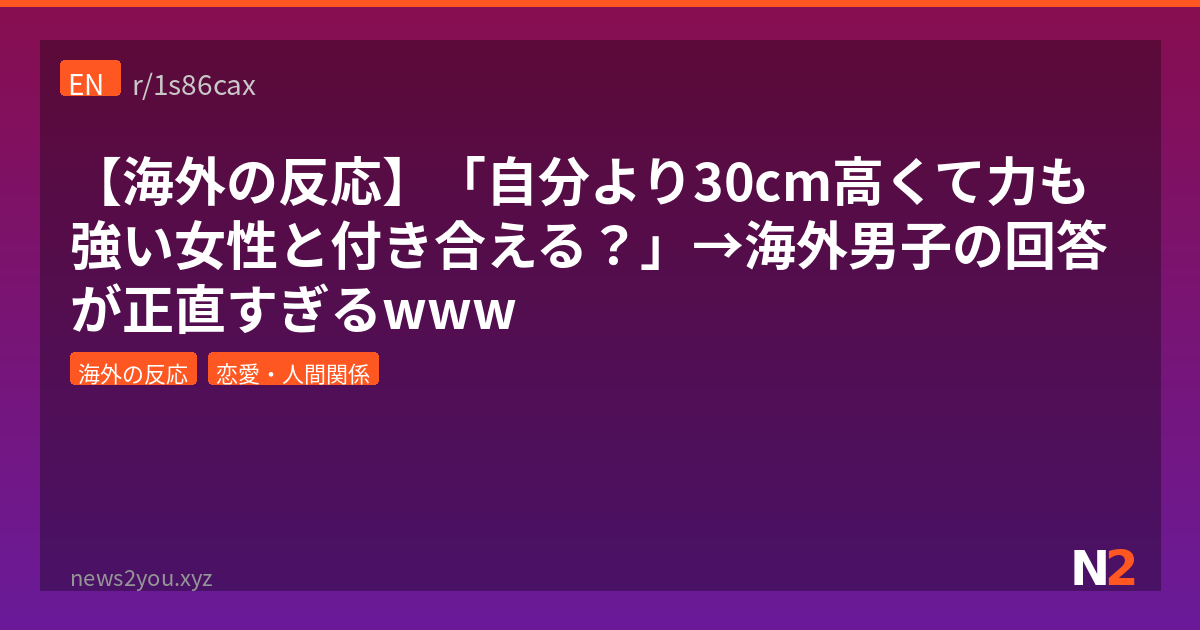 いやー今回のスレ、見事に全員前のめりで草だったわ。「自分より30cm高くて力も強い女性と付き合える?」って質問に対して、ほぼ全員が「むしろ最高」「どこにいるんだ」って回答なの、想像と違った人も多いんじゃないか?日本だと「男は女より背が高くあるべき」っていう暗黙の了解がまだ強くて、婚活サイトでも身長フィルターが当たり前に存在するよな。でも海外、特にRedditのZ世代を中心に「身長差なんて気にしない」「むしろ高身長女子最高」って価値観がかなり主流になってきてるんよ。面白いのが、自虐コメントが一番ウケてるところで、「彼女に何のメリットが?」が最高スコアなの、海外ニキたちの自己肯定感の低さと裏返しのユーモアセンスが光ってたわ。日本でも最近は「年上彼女」「高身長彼女」系の漫画が増えてるし、従来のジェンダー観は世界的に変わりつつあるんだなって感じる。ちなみに統計的には、身長差が大きいカップルほど女性の満足度が高いって研究もあるらしい。おまえらはどうよ?30cm差の高身長パワー系彼女、アリかナシか、コメントで教えてくれ。