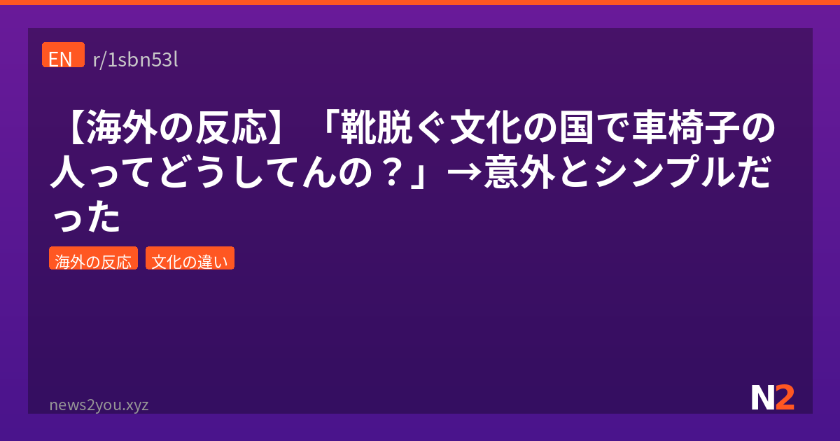 「家の中では靴を脱ぐ」って日本人にとっては当たり前すぎて疑問にも思わないけど、海外のRedditで「車椅子ユーザーはどうしてるの?」って質問が投稿されて話題になってたんよ。言われてみれば確かに!ってなる盲点だわこれ。室内用の車椅子にわざわざ乗り換えるのか、それとも車輪を拭くのか、はたまた「もう気にしない」なのか。世界中から集まった回答が面白かったからまとめたで。