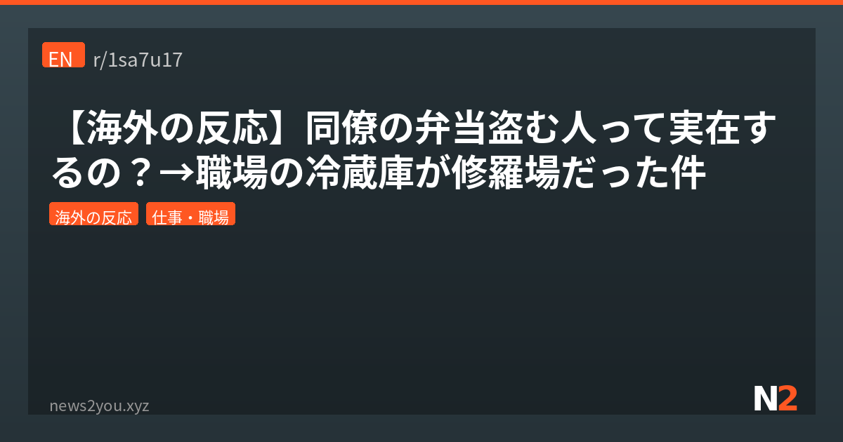 ✍️ 管理人: 感想戦まで仕掛けてくるの、サイコパスの所業すぎるだろ……。日本だと弁当泥棒ってほとんど聞かない気がするけど、それは「自分の弁当箱を持ってくる文化」が根付いてるからかもしれん。コンビニ弁当みたいな既製品じゃなくて手作り弁当だと、容器でバレるから盗みにくいってのもあるよな。ちなみにアメリカのオフィスだと共有冷蔵庫に紙袋やタッパーをドンと入れるスタイルが多いから、「誰のか分からん」って言い訳が成立しやすい環境なんだと思う。施錠冷蔵庫に避難申請って、もはや弁当の亡命やんけ。