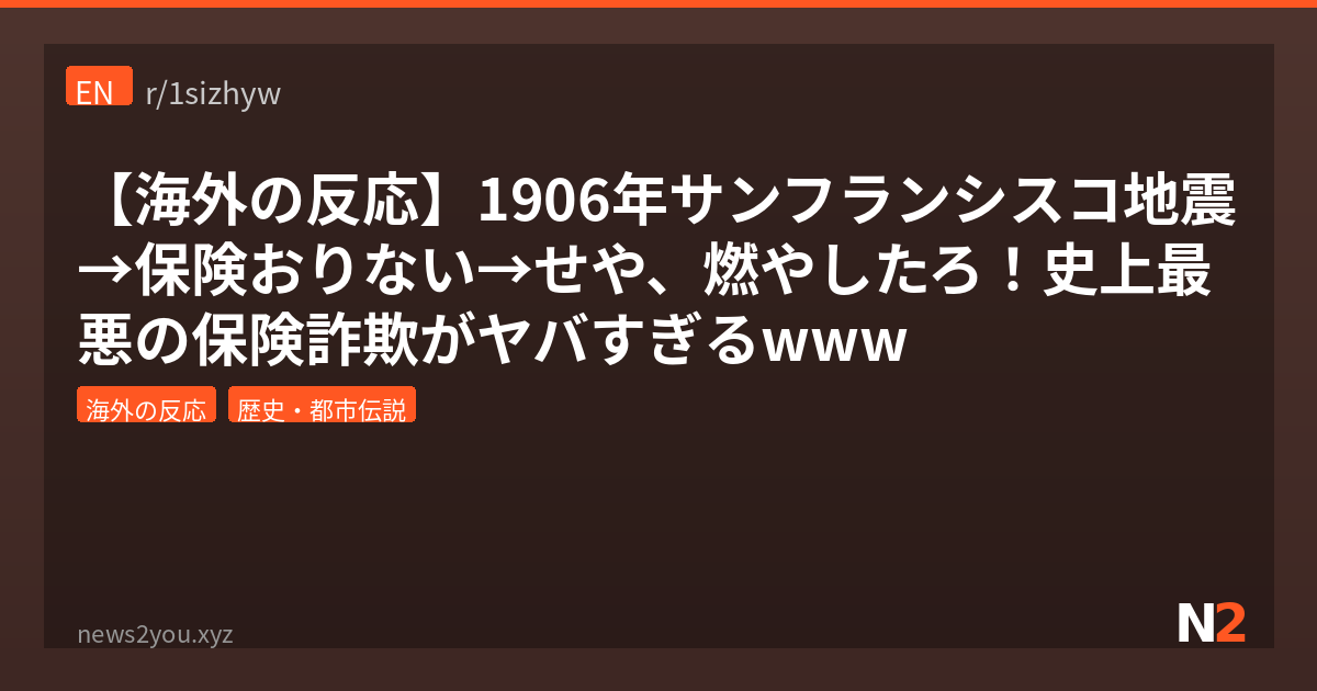 おまいら、1906年のサンフランシスコ大地震って知ってるか?市の80%が焼失した大災害なんだけど、実はあの大火災、ガス管の破裂だけが原因じゃなかったらしいんよ。なんと「地震じゃ保険おりないけど火災なら出る」って気づいた住民たちが、自分の家に放火しまくってたんだとwww Redditの r/todayilearned で5600以上のUpvoteを集めたこの話題、コメント欄も大盛り上がりだったから紹介していくで。