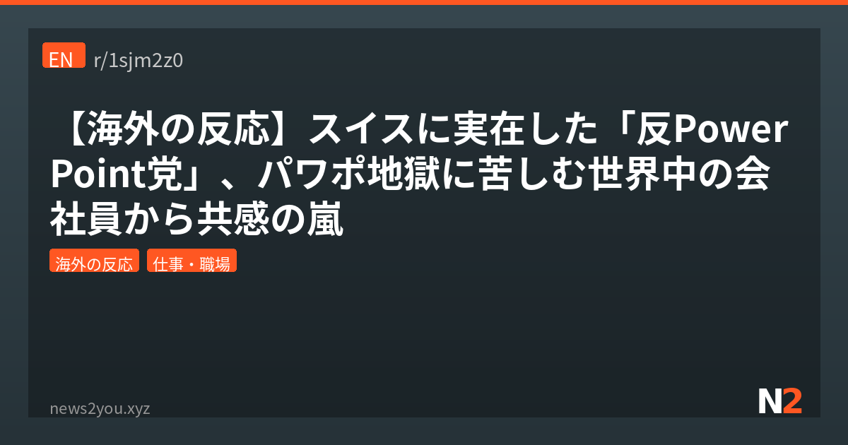 お前ら、スイスに「反PowerPoint党」っていう政党がガチで存在してたの知ってた?唯一の公約が「PowerPointなどのプレゼンソフトの業務利用を減らすこと」で、こういうソフトのせいで21億スイスフラン(日本円で約3500億円)の経済損失が出てるって主張してたんよ。Redditのr/todayilearnedでこの話題が盛り上がって、世界中のパワポ被害者たちが続々と集結してきたから紹介するわ。コンサル業界の闇とか、会議文化の病理とか、もうツッコミどころ満載で草。
