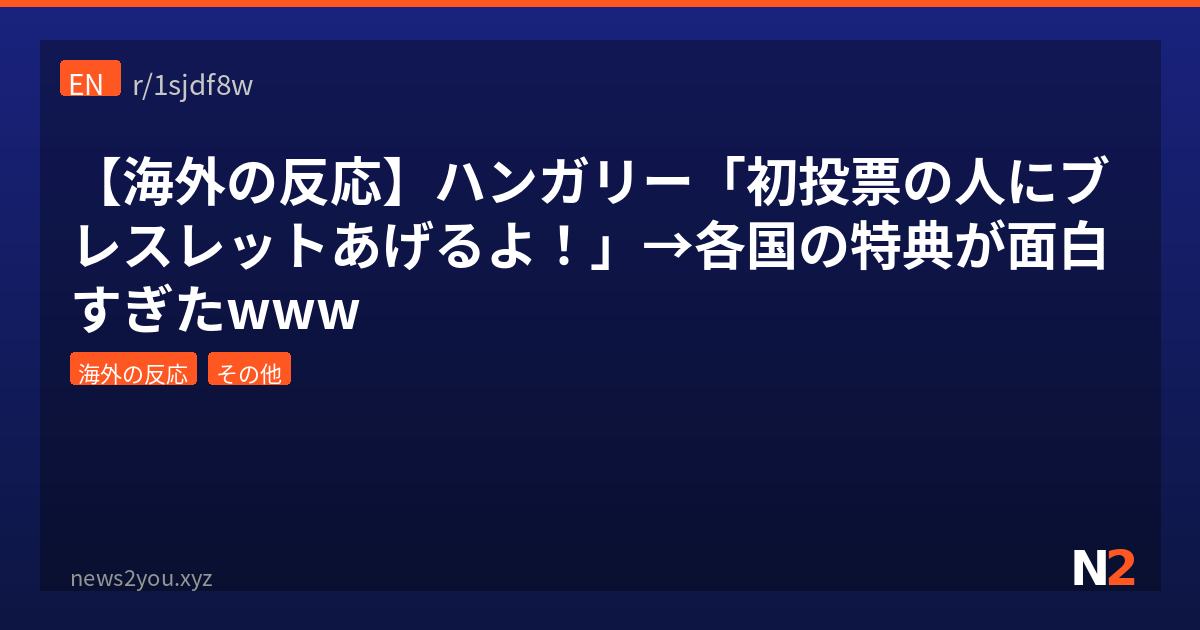 おまいら、投票行ったらブレスレットもらえるって知ってた?ハンガリーでは初めて選挙に行く若者に、国が記念ブレスレットを無料配布してるらしいんよ。日本だと投票済証明書くらいしかもらえんのに、海外はなんかオシャレやな。しかもこれ、ちょうどハンガリーで長期政権のオルバーン首相への批判が高まってる時期の話で、若者の投票率アップを狙った施策みたいなんよね。Redditで「うちの国はこうだぞ」って各国マウントが始まってたから、まとめてみたわ。
