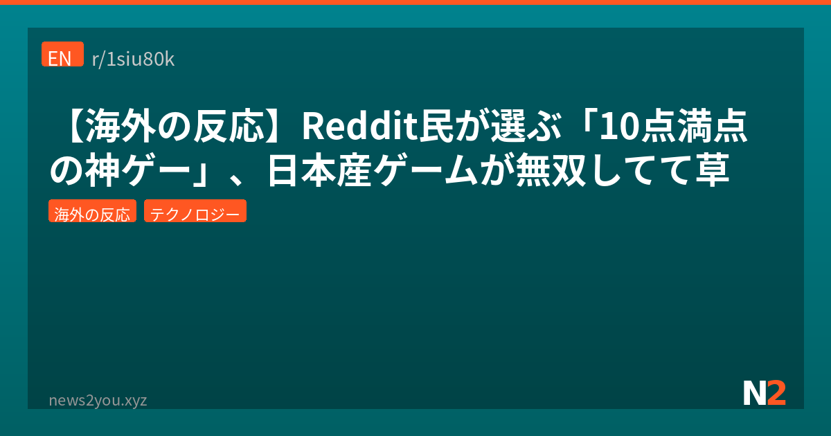 いやー、改めて見るとトップ10のうちPortal、ゼルダ、クロノトリガー、マリオワールド、月下の夜想曲、MGSと日本産が6作品も入ってるの壮観だわ。海外ニキたちが「神ゲー」って認める作品と日本のゲーマーの評価がかなり重なってるのが面白い。一方でHalo 3やBioShockみたいに「日本ではそこまでだけど海外では伝説級」って作品もあって、やっぱりゲーム文化って国によって微妙に違うんだなと。特にスターデューバレーが5位に入ってるのは、インディーゲームの存在感が年々デカくなってる証拠だと思う。日本だと「神ゲー」の話題になるとペルソナ5とかニーアとかFF系が挙がりそうだけど、Redditだとそのへんが入ってこないのも興味深い。コメント2500件超えてるってことは、まだまだ名前挙がってないだけで推されてるゲームは山ほどあるはず。みんなの「10点満点の神ゲー」は何?日本のゲームで海外にもっと知られるべき作品があったらコメントで教えてくれや。