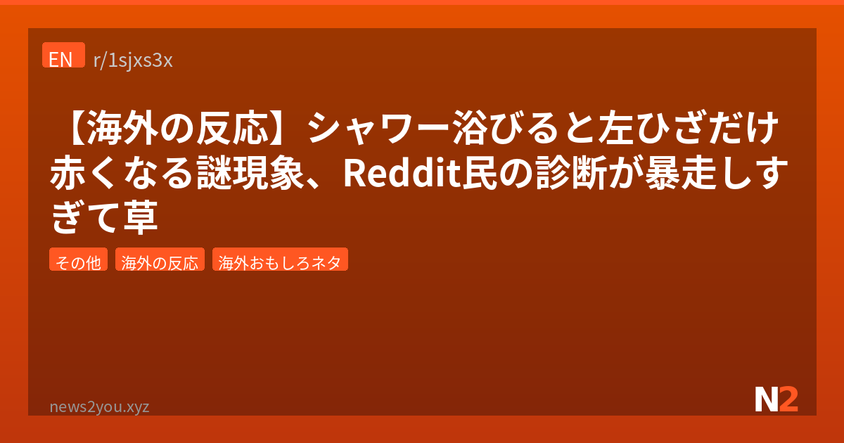 いやー、「左ひざだけ赤くなる」っていうシンプルな投稿からここまで話が広がるRedditって本当に面白いわ。真面目な考察としては、過去のケガによる皮膚組織の変化で温水に反応しやすくなってるっていうのが一番ありそうな原因なんよな。日本だと皮膚科の初診が3割負担で1000〜2000円くらいだけど、アメリカだと保険なしで数万円コースだから、まずRedditで聞くっていう行動パターンになるのも納得だわ。コメント欄見てて思ったのは、同じ症状の人が世界中にいるってわかるだけでも安心感あるよな。日本だと「お風呂上がりに傷跡が浮き出る」のは割と知られてるけど、膝ピンポイントで出る人がこんなにいるとは思わなかった。温熱蕁麻疹とかコリン性蕁麻疹は日本でも5〜10人に1人くらいの割合で経験するらしいから、心当たりある人多いんじゃないか? みんなもシャワー後に体の一部だけ赤くなるとこある? あったらコメントで教えてくれ、謎のシャワー膝同好会の日本支部作ろうぜw