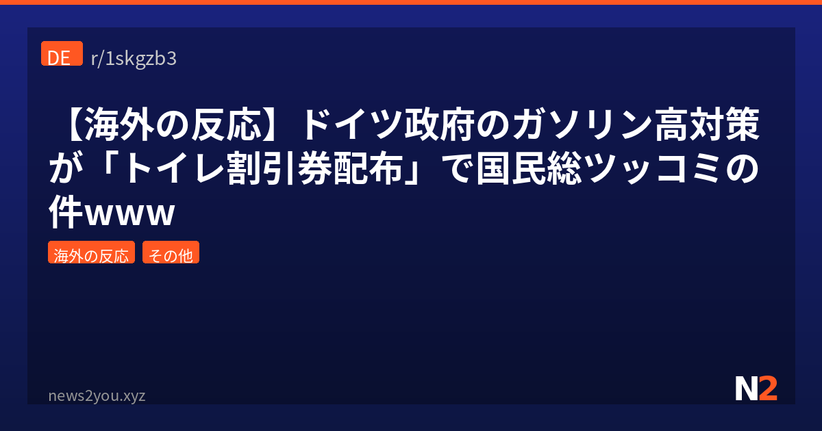 ✍️ 管理人: これ風刺記事の中の一節を引用してるんだけど、50セントのクーポン配ったら51セント値上げされるっていう「焼け石に水どころかマイナス」オチ、秀逸すぎるやろ。しかも「中東情勢を理由に」ってのがリアルすぎてな。日本でもガソリン補助金出したら元売りが値上げしてるんじゃないかって話あったし、構造的に同じ問題を抱えてるんよな。ちなみにドイツのガソリン価格はリッター1.8〜2.0ユーロ(約290〜320円)くらいで推移してて、日本より全然高い。