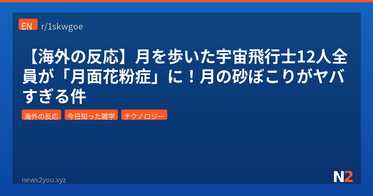 おまいら、月の砂ぼこりがマジでヤバいって知ってた?実はアポロ計画で月面を歩いた12人の宇宙飛行士、全員が「月面花粉症(lunar hay fever)」ってやつを経験してたらしいんよ。くしゃみ、鼻づまり、目の炎症…しかもこの月の砂、焦げた火薬みたいなにおいがするとか言うんだわ。月って見た目はロマンチックだけど、実際はとんでもない毒砂まみれの世界だったってわけ。Redditのr/todayilearnedでこのネタがバズってたから、海外ニキたちの反応をまとめてみたで。