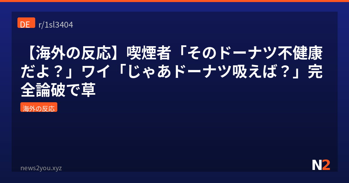 いやー今回のスレ、ブラックユーモアの応酬がキレッキレで楽しかったわ。『健康に一家言ある喫煙者』って日本にもいるけど、海外だともっと露骨らしくて、非喫煙者のささやかな贅沢にまで口出ししてくるんよな。そしてそれに対する『ドーナツ吸えば?』の破壊力よ。これぞドイツ流の論破って感じで草。ちなみに日本の喫煙率は約15%、ドイツは約25%でまだまだ喫煙文化が根強いんよね。でも最後のコメントにあるように、結局『でも○○はどうなんだ』理論って誰も幸せにしない不毛な議論なんよな。自分の健康は自分で管理するのが一番やし、他人の食生活に説教するのは野暮。みんなの職場にも『健康にうるさい喫煙者』っておる?ワイは前職でマジでおって、毎日ランチの説教されてキレそうやったわw