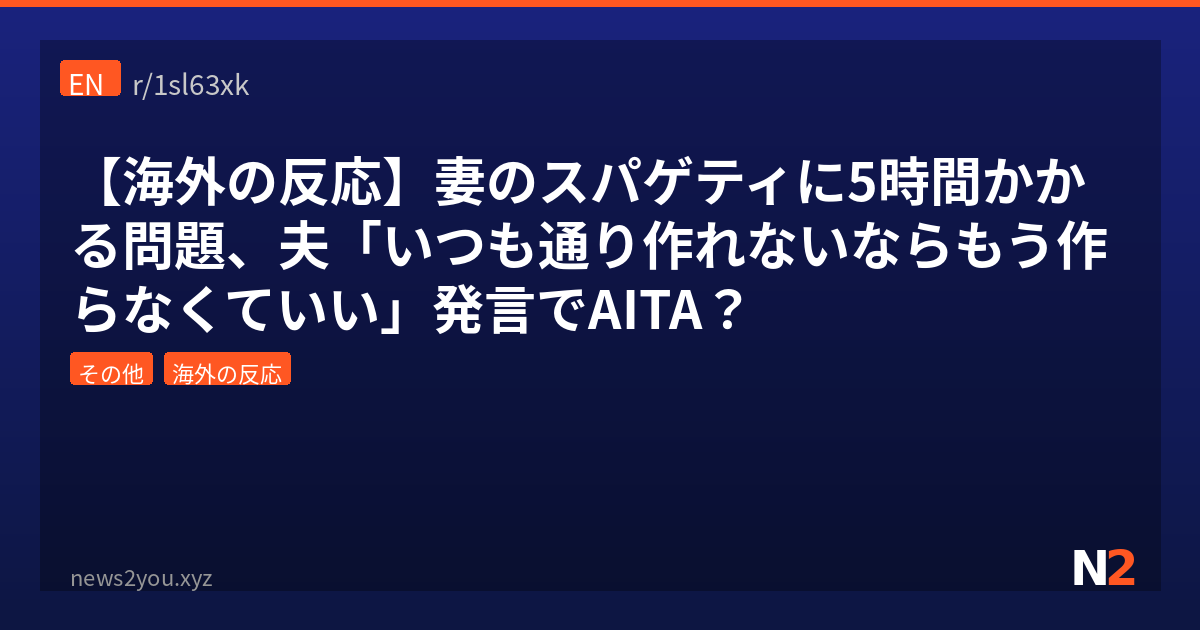 アメリカ人夫婦の料理分担スレが物議を醸してるんよ。普段は95%夫が料理担当、でも妻の十八番スパゲティ&ミートボールだけは絶品…なんだけど作るのに5時間かかるらしい。ある日妻が「玉ねぎ抜きで作る」って言い出して、夫がブチ切れた案件や。海外のRedditでも賛否両論でワロタwww