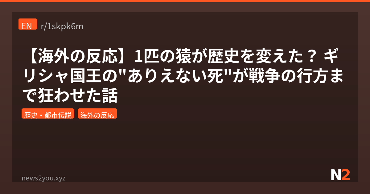 1920年、ギリシャ国王アレクサンドロスが飼い犬をかばおうとしてペットのサルに噛まれ、まさかの敗血症で死亡。このアホみたいな事件がガチで政局を崩壊させて、ギリシャは希土戦争で大敗、チャーチル曰く「25万人の命が失われた」らしいんよ。サル1匹が歴史を動かしたとか、フィクションでもなかなか書けんやろ…って話題がRedditで盛り上がってたわ。