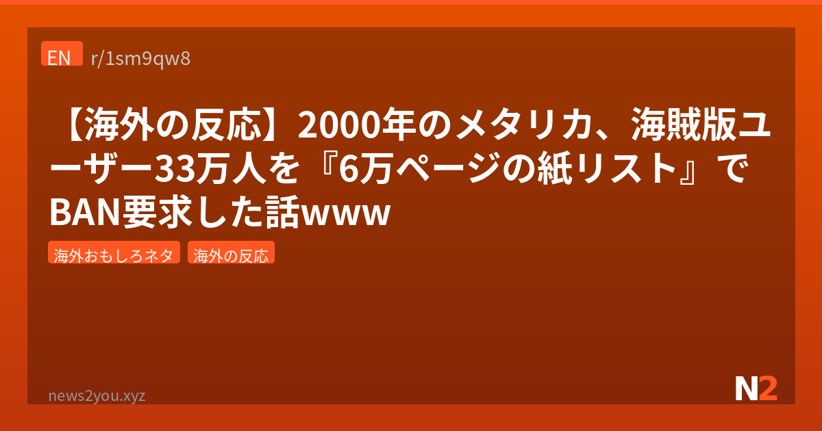 Napster騒動って知ってる?ネット黎明期の2000年、メタリカが違法DLユーザーを特定するためにわざわざコンサル会社まで雇って、33万人分のリストを6万ページの紙束にしてNapsterオフィスに乗り込んだっていう伝説の事件なんよ。今思えばアナログすぎて逆に草なんだけど、当時は音楽業界が本気でキレてたんやな。コメ欄のツッコミがキレッキレで笑えるから見ていこう。