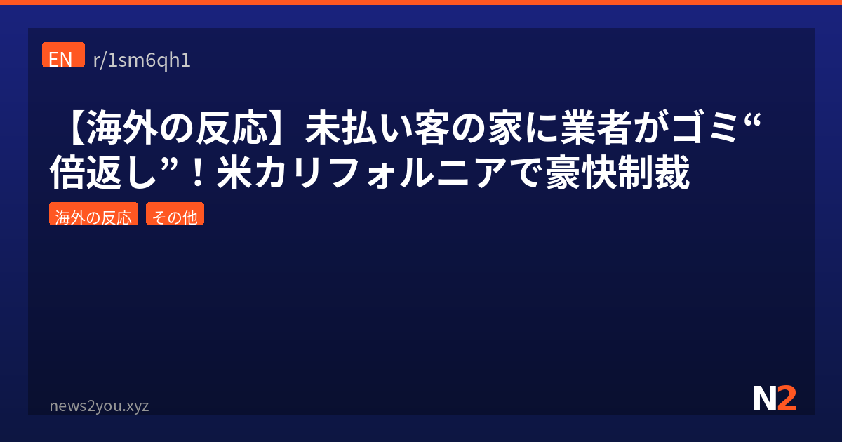 ✍️ 管理人: これ完璧に筋が通ってるやろ。アメリカのダンプスターレンタル、相場で1週間300〜600ドル(約4.5〜9万円)くらいするから踏み倒されたら業者もたまらんのよ。日本だと産廃業者が個人宅に直接ゴミぶちまけたら器物損壊で一発アウトやけど、アメリカの「返しただけ定期」ノリが海外らしくて草。ちなみにカリフォルニアは不法投棄の罰金がクソ重くて最大1万ドルらしいけど、これは元の持ち主に返しただけなのでセーフ理論が通るのかもな。