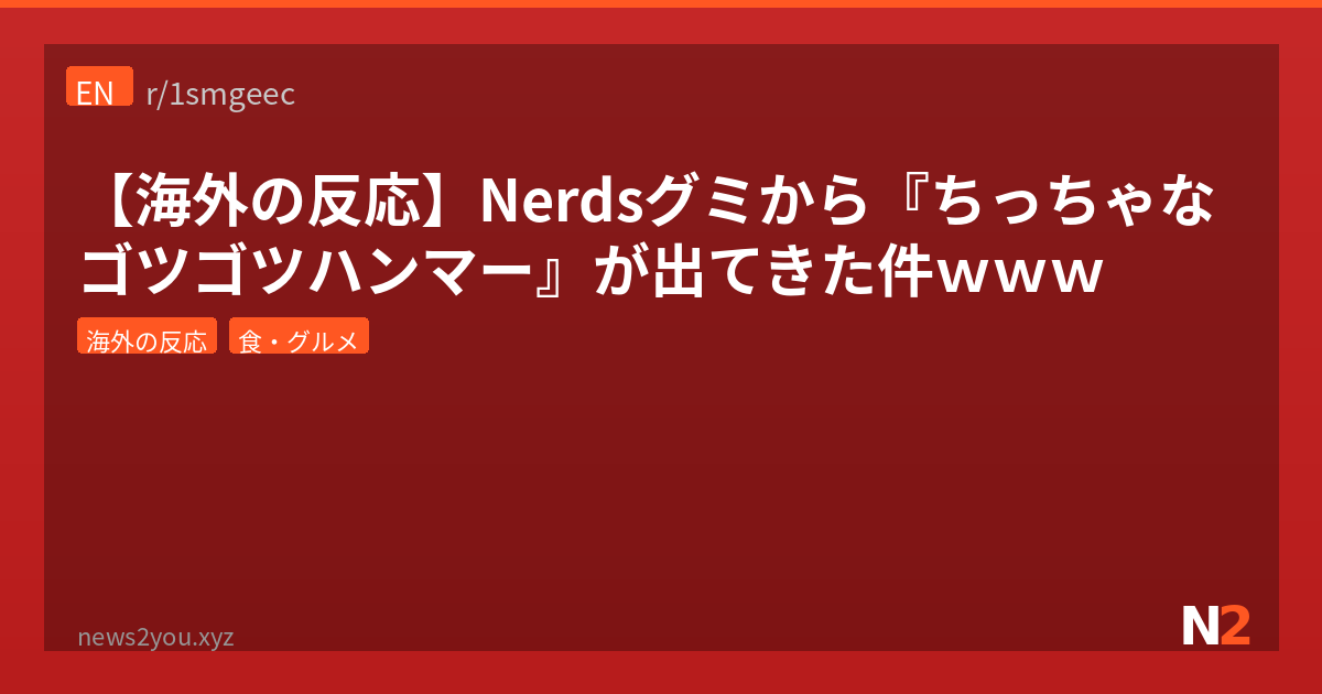 アメリカの定番駄菓子「Nerds(ナーズ)」のグミ版から、まさかのハンマー型の塊が出てきたらしい。製造過程でくっついちゃったやつなんやが、Redditの連中が見事に大喜利へ突入してて草。海外の大喜利センス、やっぱレベル高いわ。