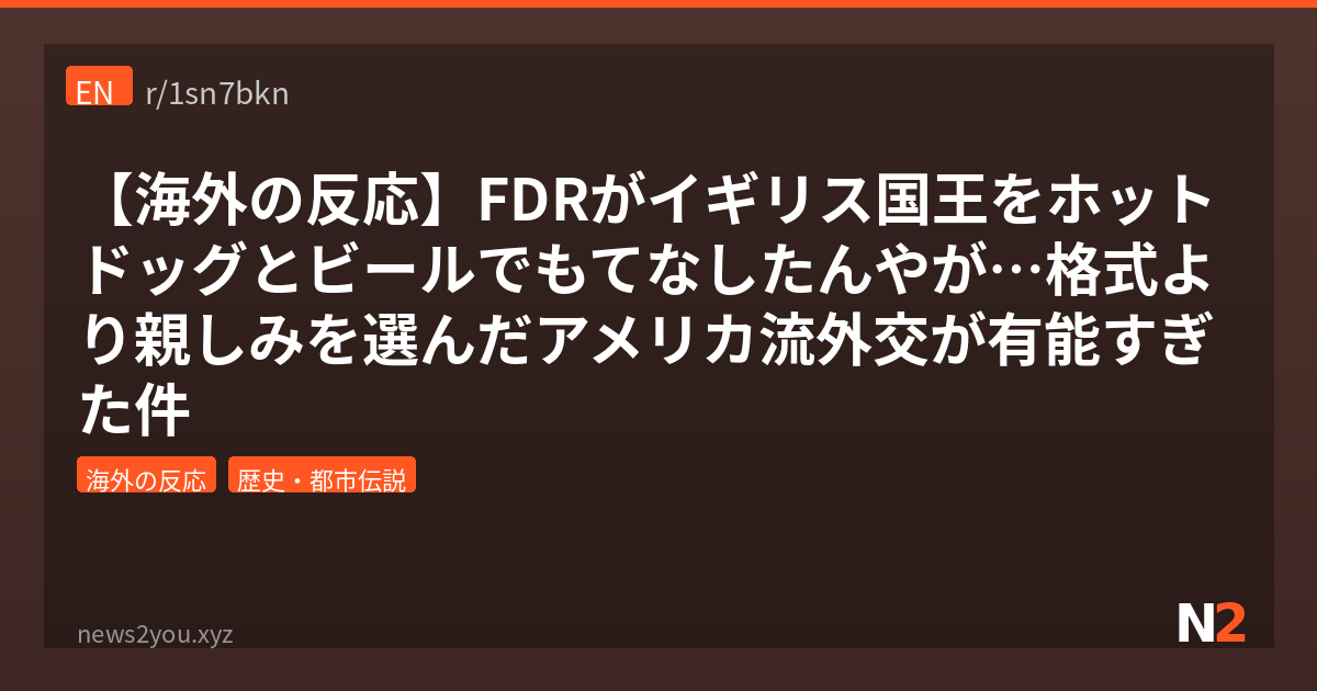 いやー、FDRのホットドッグ外交、調べれば調べるほど神采配だったわ。1939年のハイドパーク・ピクニックは、表向きはただの軽食会やったけど、実は英米同盟を強化する超重要な外交イベントだったんよ。当時のイギリスはナチスの脅威に怯えてて、アメリカの支援が喉から手が出るほど欲しかった状況。そんな中でFDRが格式張らずホットドッグを出したことで、ジョージ6世は「この男は信頼できる」と感じたらしい。日本の外交って懐石料理とか格式重視で、それはそれで素晴らしいんやけど、アメリカ流の「親しみやすさで心を掴む」戦略も学ぶべき点多いよな。ちなみにこのエピソード、イギリス側では最初「国王に対して失礼では?」って議論もあったらしいけど、ジョージ6世本人が楽しんだことで全部ひっくり返った。真の外交って、メニューの豪華さじゃなく相手への敬意の示し方なんよな。みんなだったら、もし国王クラスの超VIPをもてなすとしたら何を出す? ワイなら近所の旨いラーメン屋連れてくかも。