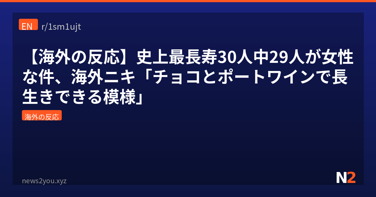 人類史上、確認された長寿ランキングのトップ30のうち、なんと29人が女性だったって知ってた?これ単なる偶然じゃなくて、遺伝子レベルで女性の方が長生きしやすいって話なんよ。ちなみに世界最高齢記録を持つジャンヌ・カルマンおばあちゃんは122歳まで生きたんやが、その生活習慣がまた破天荒でワロタ。海外ニキたちの反応を見ていくで。
