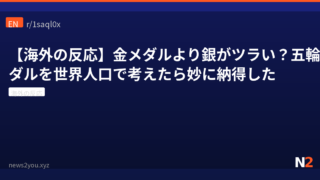 海外の反応 【海外の反応】金メダルより銀がツラい?五輪メダルを世界人口で考えたら妙に納得した 「金メダリストは83億人より上。銅メダリストも83億人より上」——シンプルなのに妙に刺さるシャワー思考に、海外掲示板が大盛り上がり。銀メダルの心理的キツさや4位の悲哀まで話題が広がっていました。 2026.04.07 海外の反応