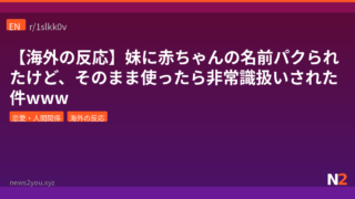 恋愛・人間関係 【海外の反応】妹に赤ちゃんの名前パクられたけど、そのまま使ったら非常識扱いされた件www 妊娠中に姉に赤ちゃんの名前を伝えていたのに、姉が双子にその名前のバリエーションを先に使用。それでも予定通りの名前を付けたら姉が激怒。海外掲示板で「あなたは悪くない」の大合唱に。 2026.04.17 恋愛・人間関係海外の反応
