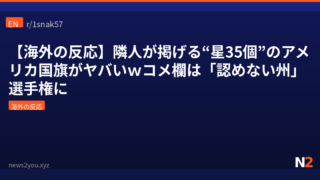 海外の反応 【海外の反応】隣人が掲げる“星35個”のアメリカ国旗がヤバいwコメ欄は「認めない州」選手権に 隣人宅に掲げられた星が35個しかない1863年のアメリカ国旗。Redditのコメント欄は「認めない州」選手権に発展し、最後は衝撃のオチが待っていた。 2026.04.19 海外の反応