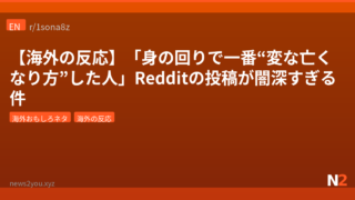 海外おもしろネタ 【海外の反応】「身の回りで一番“変な亡くなり方”した人」Redditの投稿が闇深すぎる件 Redditで話題になった「身の回りで一番変わった亡くなり方をした人」スレ。15分差で両親が逝った話、イリエワニに食われた話、自分の血小板にアレルギーで亡くなった13歳……現実の残酷さが詰まった衝撃エピソード集。 2026.04.23 海外おもしろネタ海外の反応